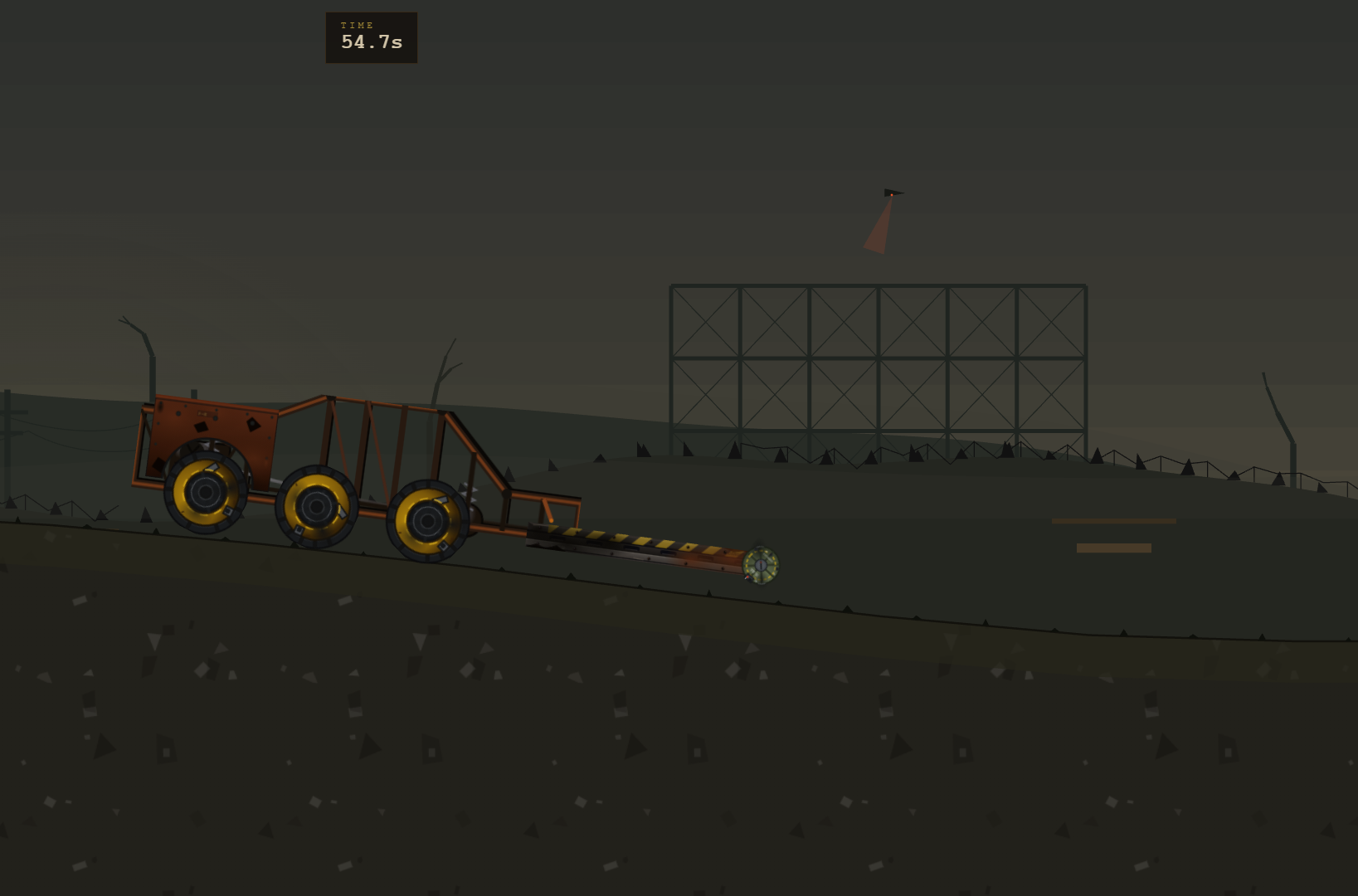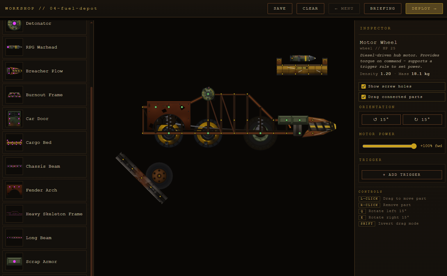 Scrapyard Automata is a physics build-a-robot game. You assemble a contraption from rusted beams, wheels, armor, warheads and detonators in a workshop, then send it off on a side-scrolling mission. You don't drive it - you design it. Event-based rules handle the behavior. Your machine rolls out on its own. If it fails, tweak the design and try again.
