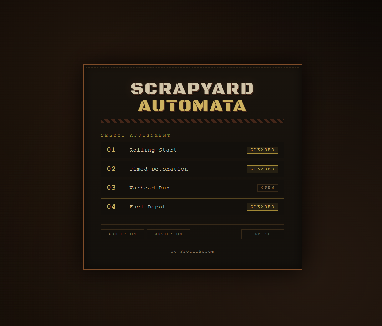 Scrapyard Automata is my first game released as part of my solo project FrolicForge. If folks enjoy it I'll keep building on it past the jam (more parts, sensors, a credits/economy layer, sandbox mode, neural-net brain stretch goal).
